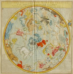 Philippe de la Hire (1640-1714). Los hemisferios estan contorneados con texto y tienen grabada una dedicatoria a Jean Paul Bignon de Herman van Loon. La Hire fue un importante astrónomo francés que publicó los dos planisferos celestes que ofrecemos como hojas separadas y posteriormente fueron incluidos en numerosos atlas franceses del S. XVIII. Las copias que ofrecemos son especialmente atractivas por los bellos colores con los que fueron iluminados y por el estilismo de las figuras de las constelaciones, la mayoría de ellas, derivaciones de los prototipos de la Uranometría de Bayer (atlas estelar producido por el abogado y astrónomo alemán Johann Bayer a comienzos del siglo XVII).. .La comunidad astrónoma francesa mantuvo una fuerte afinidad con las figuraciones de Bayer hasta bien entrado el S. XVIII, en contraste de los alemanes que rápidamente abandonaron la iconografía de su compatriota.