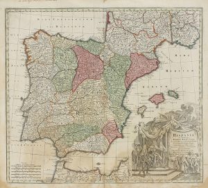 Parisiis. Aug[sburgo]: Matt. Seutteri, s.a. Mapa grabado al cobre y coloreado de época, 50 x 57 cm. Cartela grabada con la imagen de un Rey entronizado en baldaquino sostenido por angelotes. Abundante información toponímica. Papel ligeramente tostado; esquinas inferiores reconstruidas, no afecta la plancha; antigua anotación manuscrita en el margen superior. Colomer, 179.
