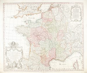 .1730 ca.. MAPA: .(GALLIA).. .SEUTTER;.. .GALLIA Concinnata ad magnum numerum mapparum.... Mapa calcográgico de la Galia. Papel: 55 x 64; Huella: 49,5 x 58 cm. Iluminado a mano y decorada con dos cartelas, una de escalas y otra con motivos...