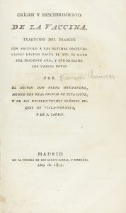 .1801.. LIBRO: .(MEDICINA).. .[CHAUSSIER, FRANÇOIS]:. .ORIGEN Y DESCUBRIMIENTO DE LA VACCINA. Traducido del francés... por Pedro Hernandez.. Madrid: Benito Garcia, 1801. 8º. Frontis + 72 p. + 3 lám. Bellamente ilustr. con 4 lám. calcográficas...