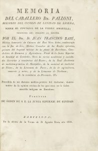 .1824.. LIBRO: .(MEDICINA).. .MEMORIA DEL CABALLERO DR. PALLONI... SOBRE EL CONTAGIO DE LA FIEBRE AMARILLA; traducida del italiano al español por el Dr. Juan Francisco Bahí.... Barcelona: Oficina de la Viuda de D. Agustin Roca, 1824. 4º menor. XXX...
