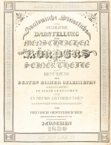 h. + 38 lám. Presentamos un total de 55 lám. grabadas con multitud de figuras detalladas de la anatomía humana, esqueleto de adulto y neonato, cráneos, extremidades, aparato muscular, etc. Enc. en cartoné muy rozado. Pequeña falta de papel en la hoja de guarda. Puntos de óxido generalizados y un pliego desprendido. Presentamos el Atlas de Anatomía de Johann Heinrich Oesterreicher, célebre sucesor de Ignaz Dollinger y Joseph August Schultes, profesor de anatomía en la Universidad de Munich y en la Escuela Quirúrgica en Landshut, controvertido personaje que cayó en desgracia y acabó sus días en un centro psiquiátrico. Primera edición, muy Rara.