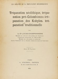 Paris: G. Steinheil, 1912. 4º menor. 131 p. + 2 h. LUCAS-CHAMPIONNIÈRE, investigador y médico francés fue el preculsor de las teorias sobre las trepanaciones prehistóricas frente a las rituales.. .Profus. ilustr. con dibujos y fotografías de diversas técnicas y morfologías de trepanación. Enc. en media piel, tejuelo; cantos ligeramente rozados. Alguna anotación a lápiz.