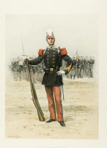 .1885-1889.. LIBRO: .(MILITARIA).. .RICHARD JULES (TEXTO) y DETAILLE ÉDOUARD (ILUSTR.):. .TYPES ET UNIFORMES. L´ARMEE FRANÇAISE.. Paris: Ed. Bousod, 1885-1889. Folio mayor. 128 p. + 33 lám. y 116 p. + 29 lám. + 6 h. Dos tomos enc. en un vol....