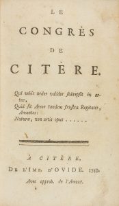 .1749.. LIBRO: .(HUMANIDADES-VIAJES).. .[ALGAROTI, FRANCESCO]:. .LE CONGRÈS DE CITÈRE.. Citère: Imp. d´Ovide, 1749. 8º. 223 p. Rara primera traducción de esta obra, donde se mitifica las diferentes maneras de amar según la nacionalidad....