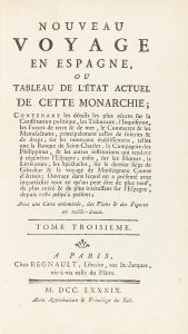 .1789.. LIBRO: .(VIAJES).. .[BOURGOING, JEAN FRANÇOIS]:. .NOUVEAU VOYAGE EN ESPAGNE, OU TABLEAU DE L´ÉTAT ACTUEL DE CETTE MONARCHIE.. Paris: Libr. Regnault, 1789. 3 vol. en 8º mayor. I: 2 h. + 368 p. + 1 h. + 8 lám. plegadas (1 mapa, 1 plano y 6...