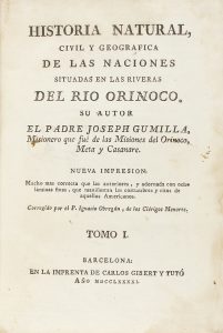 .1791.. LIBRO: .(VIAJES-ETNOGRAFÍA AMÉRICA).. .GUMILLA, PADRE JOSEPH:. .HISTORIA NATURAL, CIVIL Y GEOGRÁFICA DE LAS NACIONES SITUADAS RIO ORINOCO.. Barcelona: En la Imprenta de Carlos Gibert y Tutó, 1791. 2 vol. en 8º mayor. I: Retrato + XVI +...