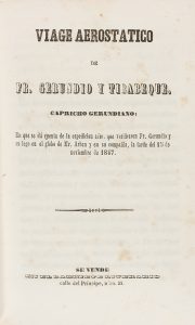 .1847.. LIBRO: .(VIAJES).. .[LA FUENTE]:. .VIAGE AEROSTATICO DE FR. GERUNDIO Y TIRABEQUE En que se da cuenta de la espedicion aérea en globo el 15 de noviembre de 1847.. Madrid: Imp. de Mellado, 1847. 8º. 2 h. + III p. + 151 p. 6 lám. grabadas....