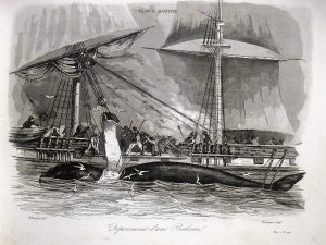 gravés, 75 (sur 80) h.-t. (t. inversés (?), incomplets d'1 pl. au t. Iet de 3 pl. au t. Ii, rouss. -affectant rarement les gravures-). Rel. de l'époque : demi-percaline chagrinée mauve, plats de papier marbré, dos lisse avec titre, filets et bateau dorés, couv. cons. (taches sur les couv., couv. sup. du t. I déreliée). Suite de lithographies extraites des tomes II et III de la seconde édition (1852-1853) en 4 vol. de la "France maritime" de Gréhan. Figurant des vues de villes (Saint-Malo, Lorient, Honfleur, Étretat, usines d'Indret...), des bateaux (catamaran, avants d'un vaisseau ancien et mod- erne, négrier...), des portraits de marins, certains avec fac-similé d'une lettre aut. (Édouard Corbière, Jean-Baptiste Willaumez...), des scènes de pêche (sardines, dépècement d'une baleine), des autochtones (habitants des cötes du Havre, de la Bretagne...), des scènes de la vie maritime (retour au port, naufrage à l'ïle de Sein, "vente des nègres", naufrage dans les glaces, "le matelot et le requin", "escadre de l'Amiral d'Estrées à Naples, Napoléon et le Bellerophon...), etc.