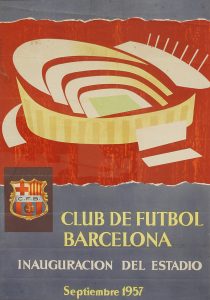 .1949-1957.. CARTEL: .(DEPORTES-BARÇA).. .CASAMAJÓ:. .LOTE DE 2 CARTELES DEL CLUB DE FUTBOL BARCELONA. INAUGURACIÓN DEL ESTADIO, Septiembre de 1957 Y UNA AUCA.. Litografía. 48 x 34 cm (19 x 13,5 in). B+. Antiguas señales de doblez, pequeña...