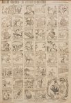 rasgadura en el margen izquierdo y pequeños puntos de óxido. [Más:] .AUCA DEL BARCELONA PER ENTRETENIR-SE UNA ESTONA.. 1899-1949. Ninots de Carnicero y lletra de Martí Coromines. 63 x 44 cm (24,5 x 17,5 in). Antigua señal de doblez central y punta inferior derecha reconstruida. B.
