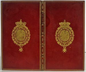 plats armoriés cernés de trois filets dorés, fin dos très délicatement fleuronné doré, filet et roul. ornée dorés sur les coupes et remplis, tranches dorées (décharges sur les gardes en peau de vélin, mouill. sur le plat sup. près du dos, lég. usure avec armoiries très lég. dédorées par endroits et coins et mors lég. frottés). Exemplaire imprimé sur peau de vélin, sans justification. Contient la "Copie d'une lettre envoyée de Dieppe sur la rencontre des armées d'Espaigne et d'Angleterre, et de la victoire obtenue par les Espagnols. Tolose, Colomiez, 1588". Provenance : Isabelle II (1830-1904), reine d'Espagne de 1833 à 1868 (supra libros armorié).