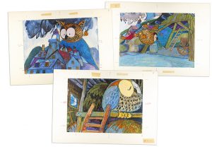 ilustradas, técnica mixta. Más 43 dibujos de .EL BÚHO .de 25 x 35 cm en papel sobre cartón de 35 x 50 cm en técnica mixta. Originales artísticos de cuentos para divulgación pedagógica.