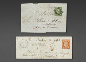 N°1b, 10c. bistre verdâtre. Paire obl. grille - N° 2, 15c. vert s/lettre obl. grille/Paris 2 oct. 51 - N° 5, 40c. orange s/lettre pour la Belgique, obl. los./dateur à cercle extérieur pointillé 5 juil.1854, et cursive 45/Fontenay s/Loing (faible).