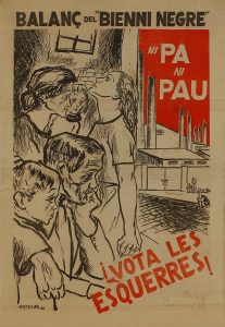 .1936.. CARTEL: .(GUERRA CIVIL Y REPÚBLICA).. .ARTECHE:. .BALANÇ DEL BIENNI NEGRE. ¡VOTA LES ESQUERRES!.. Litografía. 60,5 x 41cm (23,7 x 16,2in). B+.