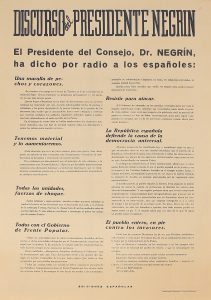 .1938 ca.. CARTEL: .(HISTORIA).. .DISCURSO DEL PRESIDENTE NEGRÍN.. Barcelona: Sociedad Gral. Publicaciones. 70 x 50 cm (27,5 x19,5 in). A-. [Más:] .EL PRESIDENTE NEGRÍN HA DICHO. .Barcelona: Imp. Elzevirina, 1938. 94 x 66 cm (37 x 26 in). Marca de...