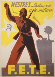 .1938.. CARTEL: .(GUERRA CIVIL Y REPÚBLICA).. .SUBIRATS:. .MESTRES ALLISTEU-VOS A LES MILICIES!. F.E.T.E.. Barcelona: Tallers Gràfics Llauger. Litografía. 100 x 70 cm (39,2 x 27,5 in). Entelado, A -.