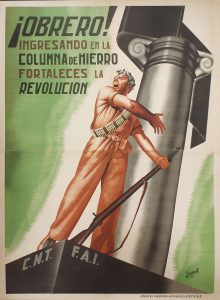 .1937.. CARTEL: .(GUERRA CIVIL Y REPÚBLICA).. .BAUSET:. .¡OBRERO! INGRESANDO EN LA COLUMNA DE HIERRO FORTALECES LA REVOLUCION.. Gráficas Valencia Intervenido CNT/UGT. Litografía. 162,5 x 120 cm (64 x 47 in). Entelado, antiguas señales de doblez...