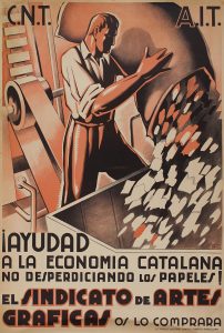 .1937 ca.. CARTEL: .(GUERRA CIVIL Y REPÚBLICA).. .OBIOLS:. .¡AYUDAD A LA ECONOMÍA CATALANA. NO DESPERDICIANDO LOS PAPELES!.. Litografía. 70 x 108 cm (27 x 42 in). Entelado, alguna reconstrucción en el margen izquierdo y superior, B.