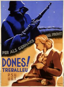 .1937.. CARTEL: .(GUERRA CIVIL Y REPÚBLICA).. .FONTSERÉ:. .PER ELS GERMANS DEL FRONT. DONES! TREBALLEU.. Barcelona: gráf. Ultra. Litografía. 137,5 x 100 cm (54 x 39 in). A-. Entelado.