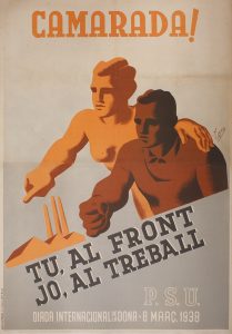 .1938.. CARTEL: .(GUERRA CIVIL Y REPÚBLICA).. .TORA:. .CAMARADA! TU, AL FRONT. JO, AL TREBALL. DIADA INTERNACIONAL DE LA DONA.. Barcelona: Gráfias Ultra, 8 Març 1938. Litografía. 144 x 100 cm. (56,7 x 39,2 in). Compuesto por 2 hojas. Entelado,...