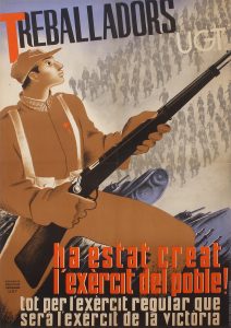 .1938.. CARTEL: .(GUERRA CIVIL Y REPÚBLICA).. .TREBALLADORS HA ESTAT CREAT L´EXÈRCIT DEL POBLE!.. Barcelona: I.G Seix i Barral; Ed. Comissió d´Agitació i Propaganda UGT. Litografía. Entelado, antiguas señales de doblez y alguna restauración...