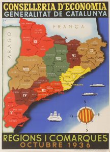 .1936.. CARTEL: .PAU:. .CONSELLERIA D´ECONOMIA. GENERALITAT DE CATALUNYA. REGIONS I COMARQUES OCTUBRE DE 1936.. Litografía. Barcelona: I. G. i Seix Barral, 1936. 124 x 90 cm (48,5 x 35 in). Marcas de doblez. A-.
