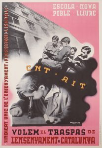 .1937 ca.. CARTEL: .(GUERRA CIVIL Y REPúBLICA).. .BADIA VILATO:. .ESCOLA NOVA POBLE LLIURE. VOLEM EL TRASPAS DE L´ENSENYAMENT A CATALUNYA. CNT-AIT.. Fotolitografía Barguño; Ed.: Sindicat Unic de l´Ensenyament i Professions Lliberals....