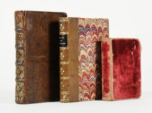 Illustré de 12 grandes figures sur bois signées PPF. A la fin, en pagination séparée, un petit traité sur la pauvreté. Bon exemplaire. On joint : Le Livre de Pensez-Y-Bien. Paris, Hérissant, 1690. In-18, velours rouge du XIX°. Usures. - LE CENE : De l’état de l’homme après le péché. Amst. Desbordes, 1684. In-16, veau de l’ép. Ensemble 3 volumes.