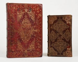 RELIURES]. [RELIURES]. Lot de 2 reliures XVII°, in-12 et in-8 en maroquin rouge, entièrement ornées aux …