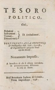 TESORO POLITICO Cioe relationi, Instruttioni, Trattati, Discorsi varii, di Ambassiatori. Nell’ Accademia Italiana di Colonia, Terza impressione, 1598. In-8, velin souple (reliure de l’époque).