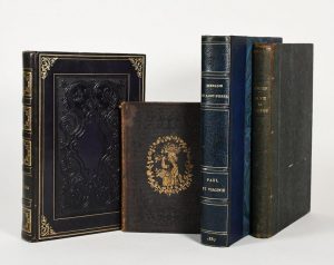 BERNARDIN DE SAINT-PIERRE. Paul et Virginie. P., Launette, 1887. In-8, demi-maroquin bleu marine, couv. et dos. Illustrations par M. Leloir - MURGER (H.). La vie de bohème. Paris, Librairie Illustrée s.d. Nombreuses illustrations. Défauts à la reliure, rousseurs - HOUSSAYE (A.). Le royaume des roses. P., Blanchard, 1851. In-12, percaline illustrée. Vignettes par G. Séguin. Rousseurs, défauts au dos, cahiers lâches - DUCIS (J.-F.). Œuvres. Suivies des œuvres de M. J. Chénier. P., Ledentu, 1839. In-8, veau prune, plats et dos ornés. Portrait. Rousseurs, menus frottis. Ensemble 4 volumes.
