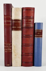 CHAMISSO (A. D. de). Histoire merveilleuse de Pierre Schlémihl ou l’homme qui a vendu son ombre. P., Westhausser, 1888. In-8, demi-chagrin cassis, couv. et dos. 106 dessins de H. Pille – OHNET (G.). Œuvres. Les batailles de la vie. P., Ollendorff, 1890. Demi-velin, couv. et dos. 10 eaux-fortes de Lalauze. Ex. sur japon non justifié avec une double suite des planches, l’une en premier état l’autre avant la lettre. Reliure un peu salie, rousseurs - SAINTINE (X. B.). Le chemin des écoliers. P., Hachette, 1861. In-8, demi-maroquin brique. 450 vignettes de G. Doré, Foster… Ex-libris. Dos passé. MONTESQUIOU-FEZENSAC (R. de). Les hortensias bleus. P., Charpentier, 1896. In-12, demi-percaline bleue, couv. et dos. E.O. Ensemble 4 volumes.