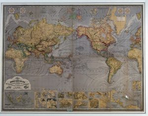 light brown stain in the centre). Under passe-partout, glass and large decorated gilt frame. Important and very nice, colorfull wall map by the famous German cartographer Baur. With celestial hemispheres and 17 smaller insert maps. # Tooley I-99 (Baur), III-192 (Maier). Provenance : Admont (label). fl Importante mappemonde murale en chromolithographie (plis, faible tache brune au milieu). Sous passe-partout, vitre et cadre de bois doré (non désencadrée).