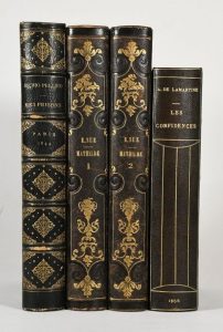 LAMARTINE (A. de). Les confidences et les nouvelles confidences. P., Pagnerre, 1866. In-8, demi-chagrin vert, dos orné, couv. 8 planches par Johannot et Foulquier - PELLICO (S.). Mes prisons, suivi des devoirs des hommes. P., Delloye, 1844. In-8, demi-chagrin bleu marine, dos orné (Hardy-Mennil). Illustré d’après les dessins de Séguin, Aubigny, Steinheil... Petits défauts à la reliure, rousseurs – SÜE (E.). Mathilde. Mémoire d’une jeune femme. P., Gosselin, 1844-45. 2 vol. in-8, demi-chagrin noir, dos ornés. Ill. par Johannot, Nanteuil, Gavarni… Reliures frottées, rousseurs. Ensemble 4 volumes.