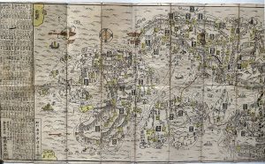 (Asie, Japon) - Ens. 2 pièces - Carte partielle du Japon, avec légende. [Ire moitié du 20e siècle]. Gravure sur bois, 36,5 x 146 cm (repliée, faiblement défraïchie, petits dégâts). Joint : Éventail dont la feuille représente la plan de...