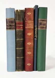 SCARRON (P.). Le Virgile travesti. P., Garnier, s.d. In-12, demi-percaline bleue, couv. et dos. Rousseurs - BANVILLE (Th. de). Socrate et sa femme. P., Calmann Lévy, 1886. In-8, demi-percaline bleue à coins, couv. Rousseurs – TONNELLE (A.). Fragments sur l’art et la philosophie. P., Didier, 1874. In-12, demi-chagrin bordeaux. Envoi. Rousseurs – Lyndamine ou l’optimisme des pays chauds. Larnaka, Della Rosa, s.d. In-12, demi-chagrin vert. Reliure très usagée, dos décollé – SAINTE-BEUVE. Poésies complètes. P., Charpentier, 1840. In-12, demi-percaline verte. Rousseurs. Ensemble 5 volumes.