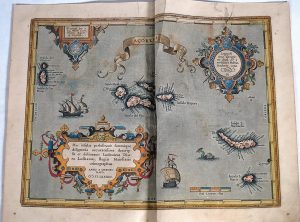 (Europe, Espagne & Portugal) — 6 cartes, 16e-18e siècles. Gravures sur cuivre, frontières ou territoires rehaussés à l'aquarelle (état moyen). ORTELIUS, A.- Asores Insulae. 1584 (faible tache marg., fortes us. sur pli central).— HOMANN,...