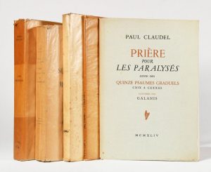 CLAUDEL (P). Verlaine. Bois gravés par André Lhote. P., Nouvelle revue française , 1922. In-8 broché. Ex. H.C. sur Lafuma. – CLAUDEL (P). Prière pour les paralysés suivi de Quinze psaumes graduels. Ill. de Galanis. P., Les horizons de France, 1944. In-8 en feuilles. Ex. numér. sur pur fil. – VALERY (P). Essai sur Stendhal. Ornements typographiques de René Ben Sussan. P., Jacques Schiffrin, 1927. In-8 broché. Ex. numér. sur velin. Rousseurs. – BENJAMIN (R). Sous l’œil en fleur de Madame de Noailles. P., Librairie des Champs-Elysées, 1928. In-8 broché. Ex. numér. sur Alfa. - ROLLAND (R). Les Léonides. Bois gravés par Lucien Boucher. P., Editions du Sablier, 1928. In-8 broché. Ex. numér. sur pur fil. Rousseurs. Ensemble de 5 ouvrages.