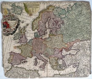 (Europe) - Ens. 30 pièces - 7 grandes cartes : Europe, Scandinavie, France, Espagne & Portugal, Italie, la Manche et les ìles des Hébrides, 17e-18e siècles. Gravures sur cuivre, rehaussées à l'aquarelle (déchirures avec manque, taches,...