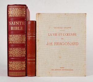GONCOURT (Edmond et Jules de). Gavarni. L'Homme et l'oeuvre. P. Fasquelle, 1925. In-8, demi maroquin rouge, t. dorée, couv. et dos. – GRAPPE (G). La vie et l’œuvre de Fragonard. Paris, Ed. pittoresques, 1929. In-4°, toile éditeur piquée – LA SAINTE BIBLE du Chanoine Crampon. Tournai, Desclée, 1961. Fort in-4°, cuir rouge orné de l’éditeur. Nbses ill. Ensemble de 3 volumes.