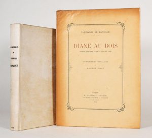 14 belles eaux-fortes en couleurs hors-texte. Tirage à 364 exemplaires numérotés celui-ci sur vergé de Rives. Rousseurs. On joint : BANVILLE (Th. de). Diane au bois. Lithographies originales de M. Eliot. Paris, Carteret, 1911. Ex. num. sur velin. In-4° broché. Rousseurs. Ensemble 2 volumes.