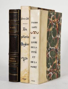 LOTI (Pierre). Pêcheur d’Islande. P. Calmann-Lévy, 1923. demi maroquin brun. (ex. numér. sur velin) – Le livre de la pitié et de la mort. P., Crès, 1922. demi velin bradel (ill. de M. de Becque). – Un pèlerin d’Angkor. P., Cyral, 1930. demi velin bradel (ill. de Marliave). Ensemble 3 volumes in-8, couvertures conservées.