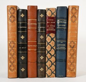 MAC ORLAN (P). La Vénus internationale. P., NRF, 1923. E.O. numér. sur velin – TAGORE (R). Le Jardinier d’amour. P., NRF, 1920. E.O. numér. sur velin. – MAIZEROY. L’adorée. Ill. de J. Roy. P., Ollendorff, s.d. – LEMONNIER (C). Un Mâle. Dessins de Geo-Dupuis. P., Ollendorff, 1904. – IDEM. Happe-Chair. Ill. de Lobel-Riche. P., Michaud, s.d. – PELADAN. Les dévotes vaincues. Les dévotes d’Avignon. P., au monde nouveau, 1922-23. 2 vol. Ensemble de 7 volumes in-12, demi chagrin ou cartonnage.