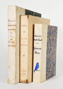 MAETERLINCK (Maurice). L'Oiseau bleu. Illustrations en couleurs de Jacques Touchet. P., Piazza, 1931. In-8, demi velin bradel, couv. Ex. numér. sur velin. On joint du même : La vie des termites. Cuivres de G. Gorvel. Versailles, Ed. princeps. In-4°, demi velin bradel, couv. 1/125 numér. sur velin. – La vie des abeilles. Ill. en couleurs de A. Giraldon. P., Ferroud, 1914-18. In-8 broché. Ex. numér. sur velin. Ensemble de 3 volumes.