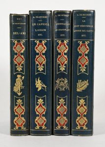 MUSSET (A. de). Œuvres. Comédies et proverbes. Paris, Lemerre, s.d. 3 vol. in-12, demi-chagrin bleu marine, dos lisse très orné, tête dorée, couvertures (Flammarion – Vaillant). Illustrations de H. Pille gravées à l’eau-forte par L. Monziès. On joint relié à l’identique : MAUPASSANT (G.). Bel-Ami. Paris, Ollendorff, s.d. Illustrations de F. Bac, gravure sur bois par G. Lemoine. Ensemble 4 volumes.