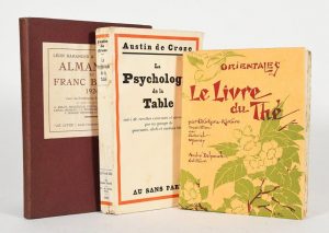 OKAKURA-KAKUZO. Le livre du thé. Illustrations de Loka-Hasegawa. Paris, Delpeuche 1927. 1/100 sur Hollande – BARANGER. Almanach du franc-buveur pour 1926. P., Chamontin, 1926 – CROZE (A. de). La psychologie de la table. P., Au sans pareil, 1928. Ensemble 3 volumes in-8, brochés.