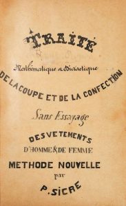 SICRE (P). Traité mathématique et didactique de la coupe et de la confection sans essayage des vêtements d’homme et de femme. Méthode nouvelle. Sans lieu, ni nom ni date (vers 1900). Manuscrit et pages imprimées collées, in-8, demi chagrin noir de l’époque.