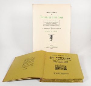 VILLIERS DE L'ISLE ADAM. La torture par l'espérance, suivi d'autres contes. Dessins d'Angélina Beloff. Paris, Œuvres représentatives, 1933. Petit in-8 broché. Ex. num. sur papier vert chartreuse de Rives – On joint du même : Trois contes. Eaux fortes de H. de Groux. P., la Connaissance, 1919. In-8 br. Ex nominatif. Ensemble 2 volumes.