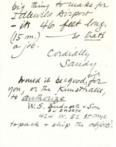 L.A.S. «Sandy», 4 février 1957, au directeur de la Kunsthalle de Bâle, Arnold RÜDLINGER; 2 pages in-4; en anglais.